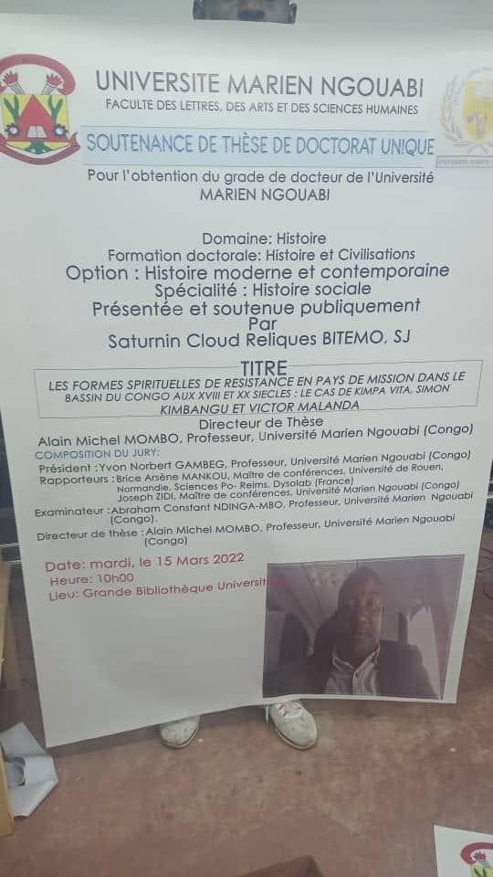 le 27 juillet 2021 à l'auditorium de la Grande Bibliothèque Universitaire de Brazzaville sous la direction de thèse de Feu Professeur Dominique NGOïE NGALLA, Professeur Titulaire de l'Université Marien NGOUABI et pour Codirecteur de thèse, Michel Alain MOMBO, Professeur Titulaire de l'Université Marien NGOUABI.