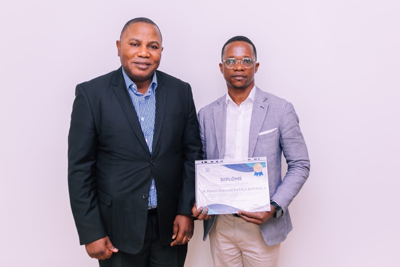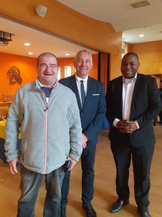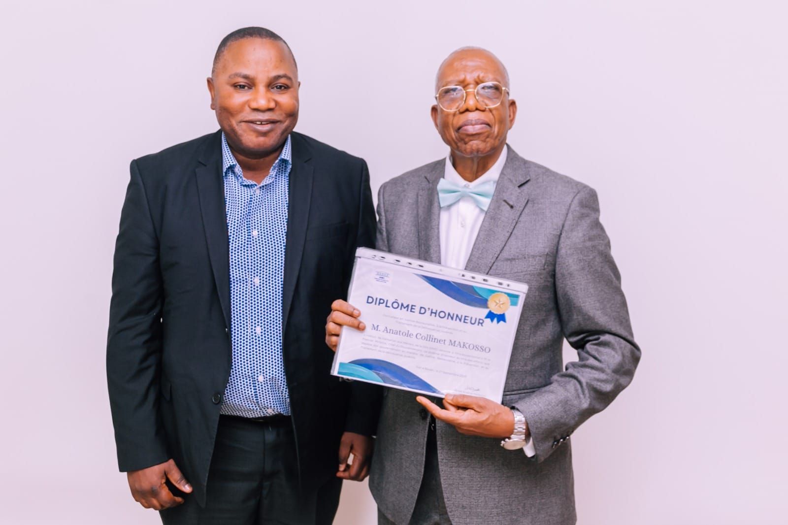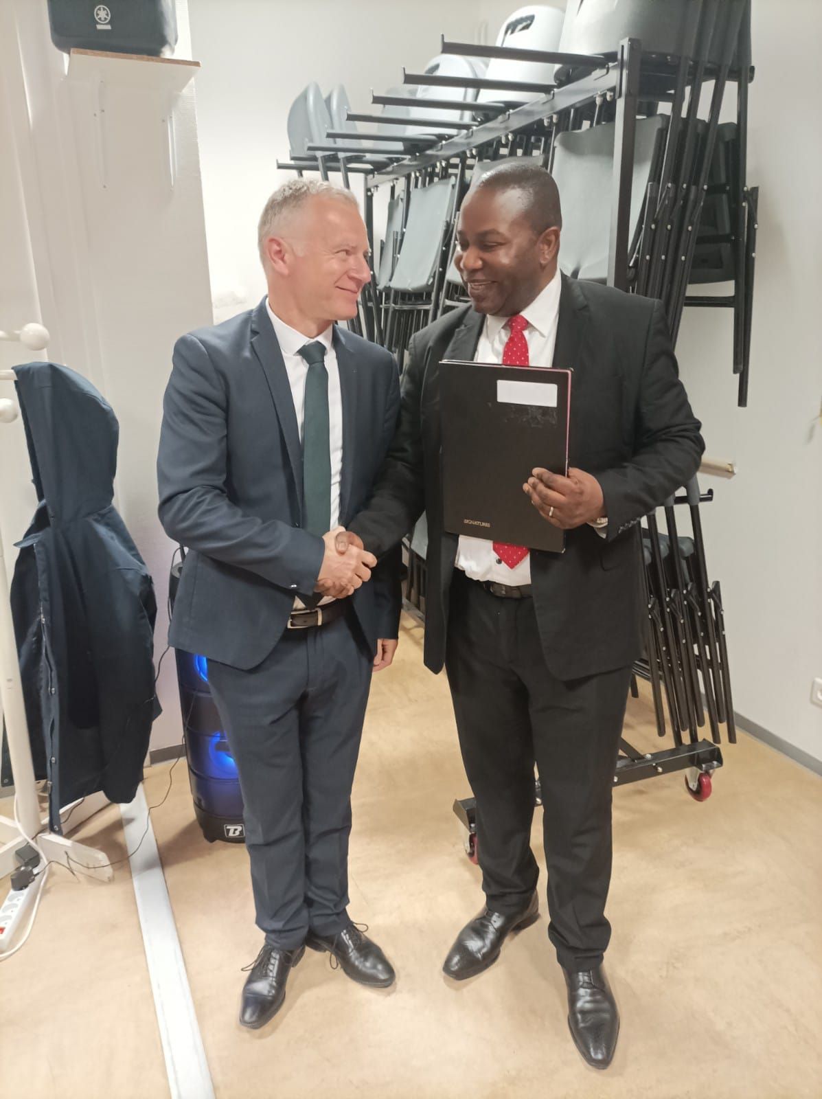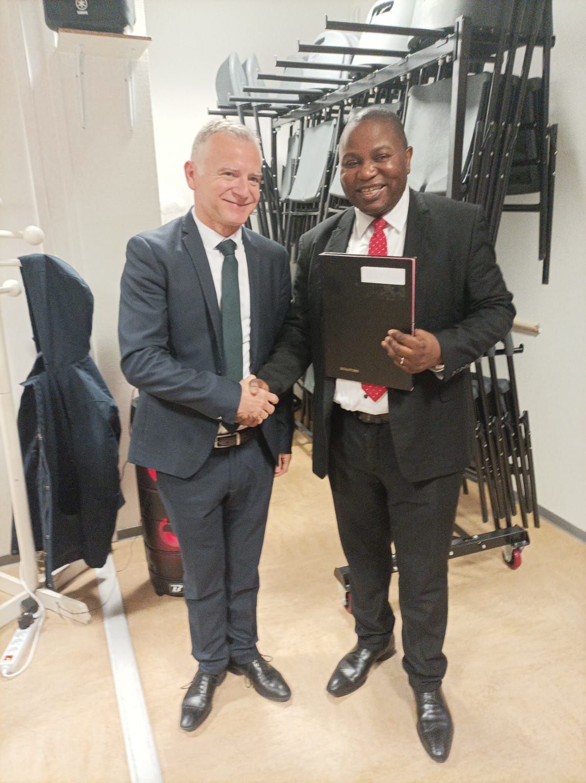 Brice Arsène Mankou, recevant les félicitations de Monsieur Emmanuel Brouiller, Consul du Congo en Normandie